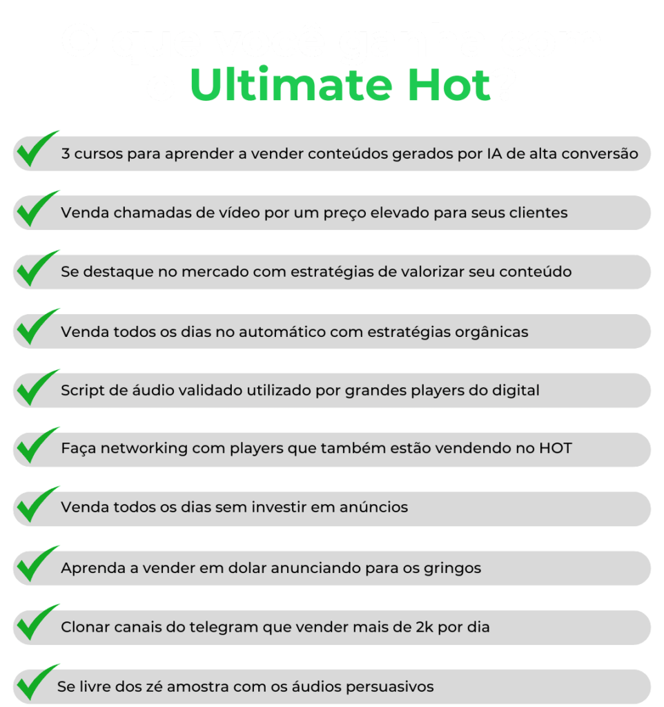 O Pack de ferramentas HOT é um conjunto completo de cursos, estratégias e ferramentas premium voltados para o nicho HOT. Ele foi desenvolvido para ajudar você a vender conteúdos gerados por IA com alta conversão e potencial de escalar suas vendas. É o mesmo arsenal utilizado pelos grandes players para vender todos os dias.